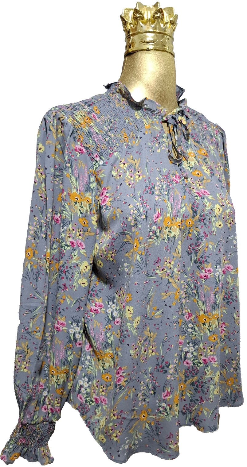 شومیز طوسی طرح گلدار یقه ی مدل دار و مچ کشدار جنس بسیار مرغوب کد A+11